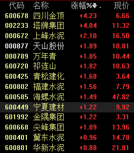 周一早盘,水泥板块全线上涨,截至发稿,四川金顶、塔牌集团涨超4%,上峰水泥、天山股份、万年青、祁连山等跟涨。