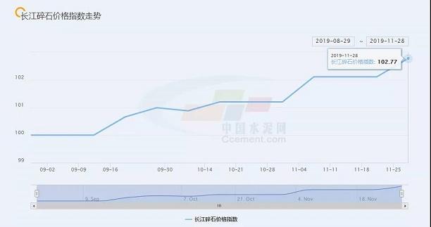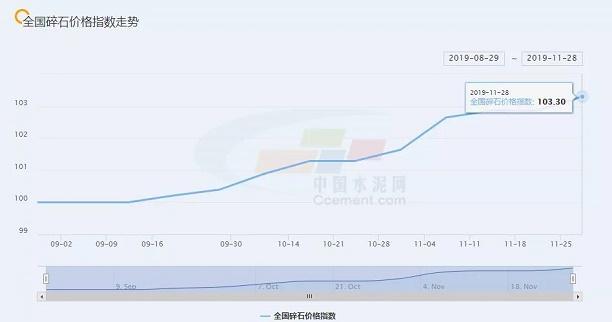 碎石价格指数基期2019年8月22日为100点,11月28日,碎石价格指数涨至103.3点,8月中旬以来全国碎石价格总体上涨3.3%。